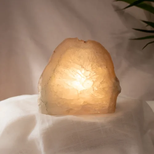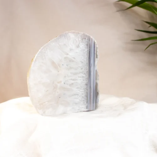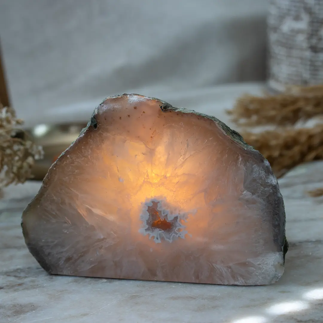 Den här agat ljuslyktan har ett mjukt och rått uttryck, med en polerad front i dimmiga gråvita toner och naturlig yta runtom. När ett ljus tänds sprids ett varmt sken genom agaten och lyfter fram de fina, strålande mönstren och den lilla öppningen i mitten. En rofylld naturform med levande djup.