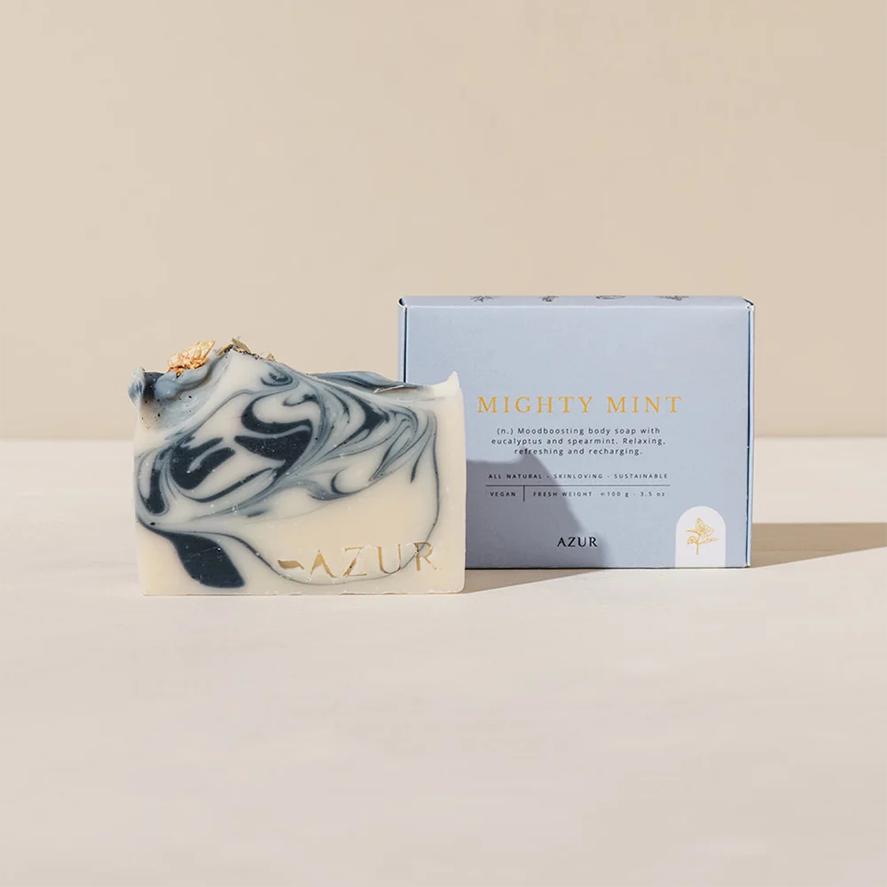 En riktigt uppfriskande tvål med dofter av eukalyptus och pepparmyntas eteriska oljor. Den vackra blå färgen kommer från bladen av växten Indigofera Tinctoria. Mighty Mint innehåller även kaolinlera, som milt renar huden. Denna kroppstvål kommer att överraska dig – efter att ha provat den en gång kommer du inte kunna vara utan den!