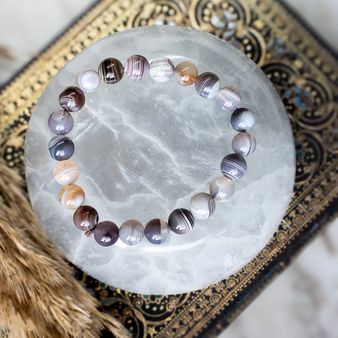 Agat är en mycket fin sten för känsliga människor och barn, den verkar jordande och lugnande. Agat representerar självacceptans och självförtroende samtidigt som den stärker kontakten med ditt inre barn. Stenen sägs vara stödjande vid känslor, stress, ensamhet, besatthet och negativa tankar. Den främjar känslomässig balans och hjälper dig att få klarhet i olika situationer. Dessutom är agat skyddande och ger en känsla av säkerhet och lugn.