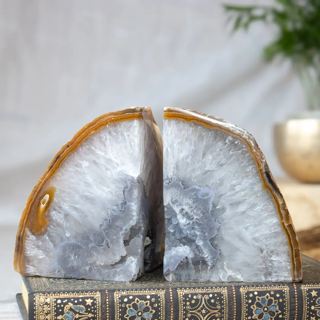 Bokstöd i naturlig agat, slipade i två delar med en rå honungsbrun kant. Insidan är polerad och visar ljusgrå till blågrå kristall med en liten rå hålighet i mitten. Stadiga och dekorativa på en hylla eller ett skrivbord.